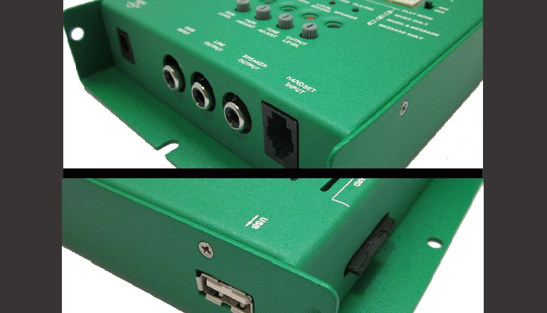 • Supports both .WAV and MP3 files • High speed USB 2.0 host port • 15kHz audio bandwidth • Adjustable dual output (8 Ohm/ 600 Ohm) • Integrated monitor speaker • Audio message lengths completely dynamic • High quality playback support of up to 2GB memory • Excellent signal to noise ratio and dynamic range • RJ22 for local record handset • 20 individual audio message switches • Manual controls for BGM level, BGM fade amount, output volume, append mode, speaker enable •