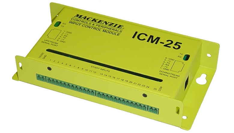 The ICM is an input control module that extends that start contact capability of Mackenzie audio messaging systems. Each unit offers 25 individual start contacts to initiate playback on the MacFi and M2. There is the possibility of up to two ICM units interfaced to allow access to an additional 50 messages.